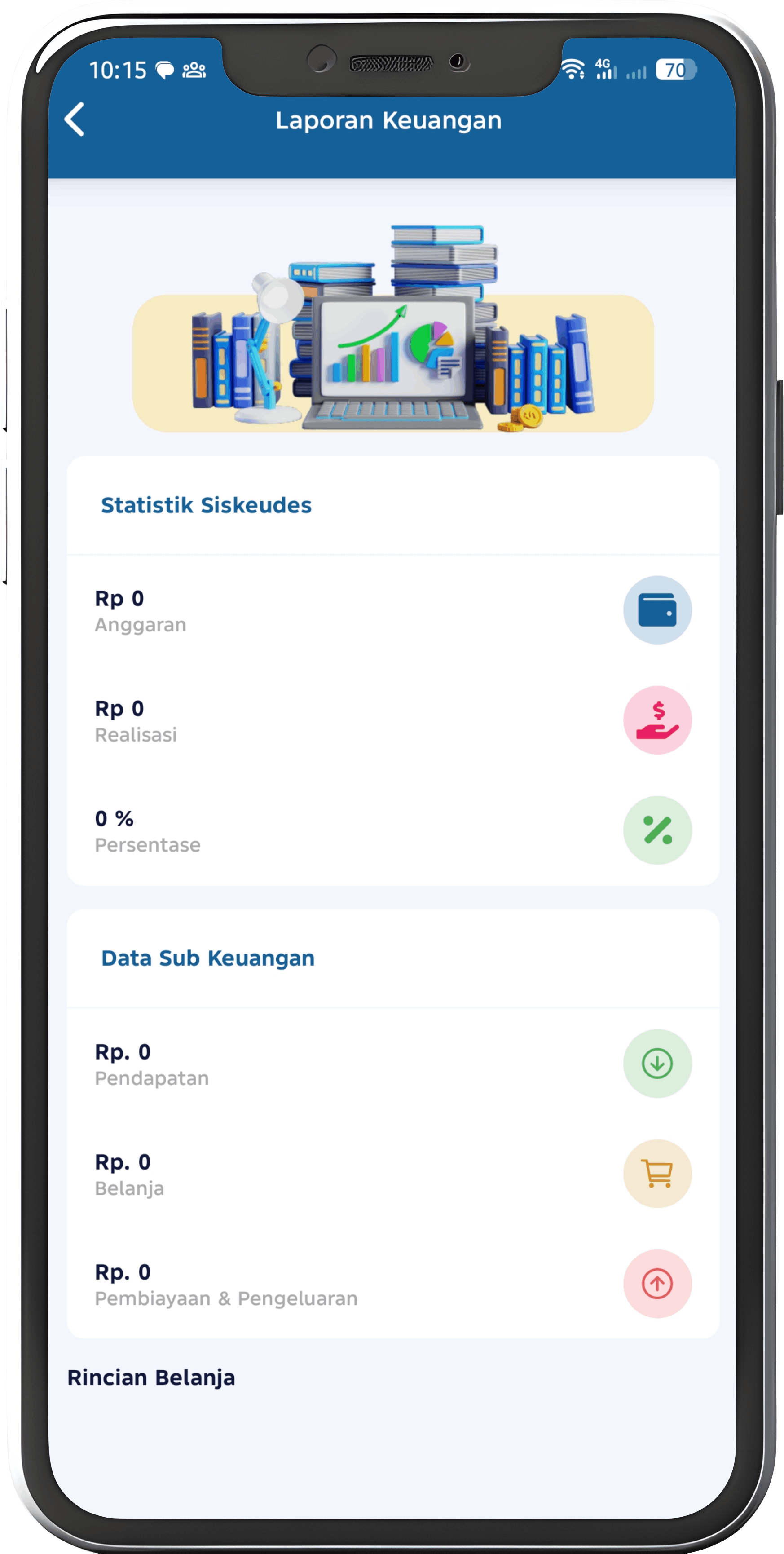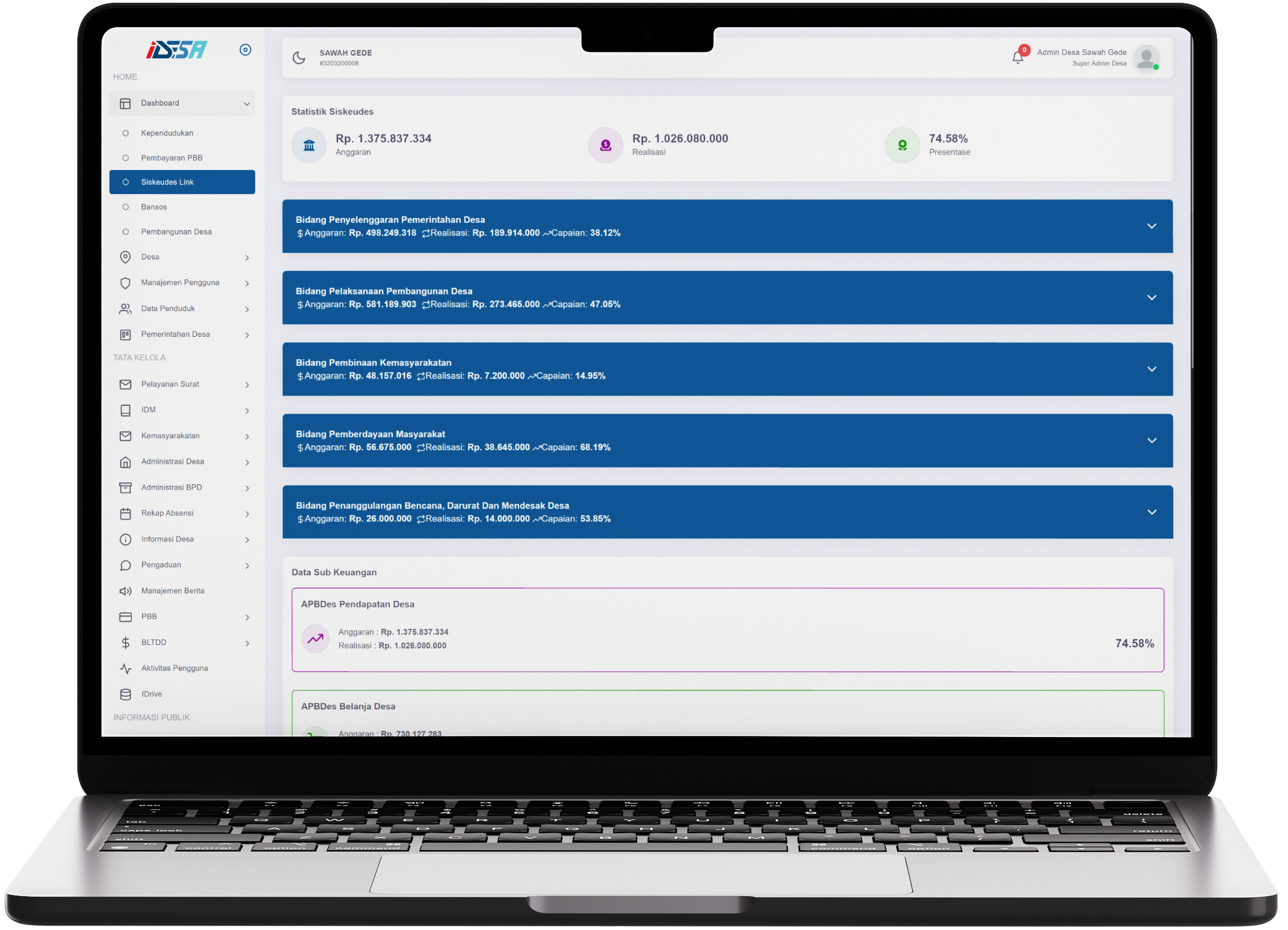 Monitoring keuangan desa terintegrasi Siskeudes untuk pengelolaan anggaran, realisasi belanja, dan pelaporan keuangan secara realtime.