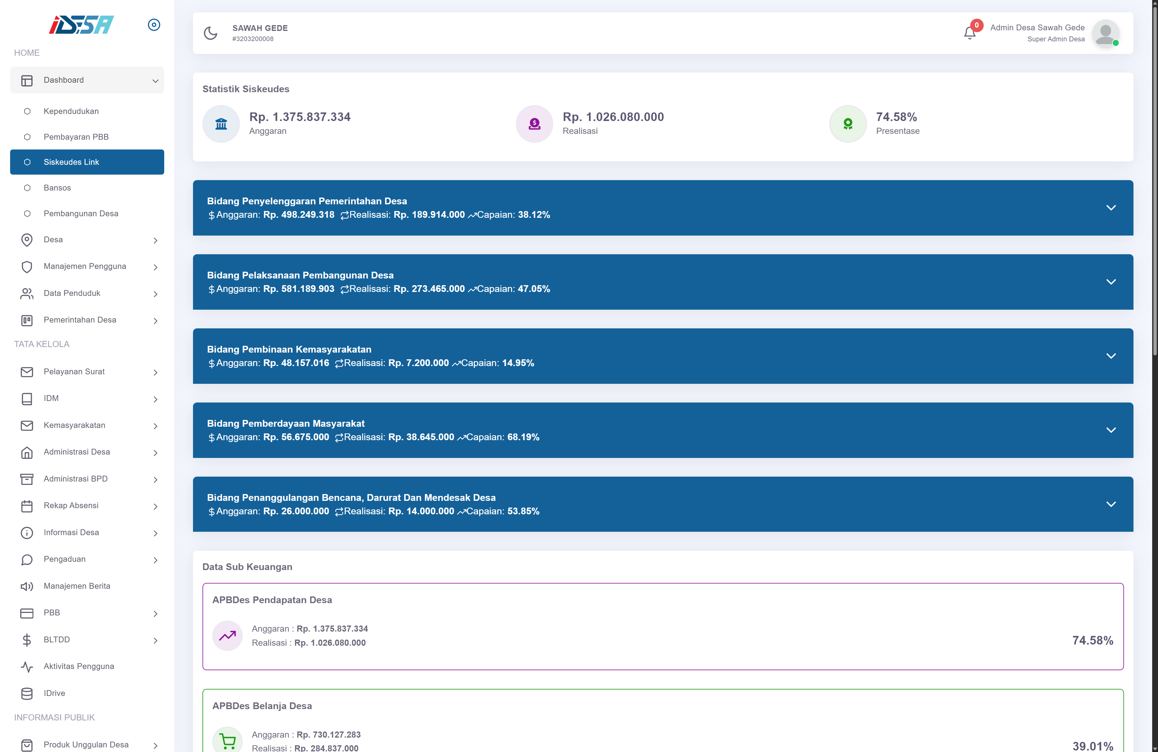 Integrasi data keuangan desa berbasis Siskeudes untuk monitoring APBDes, realisasi anggaran, dan laporan keuangan secara terpusat.